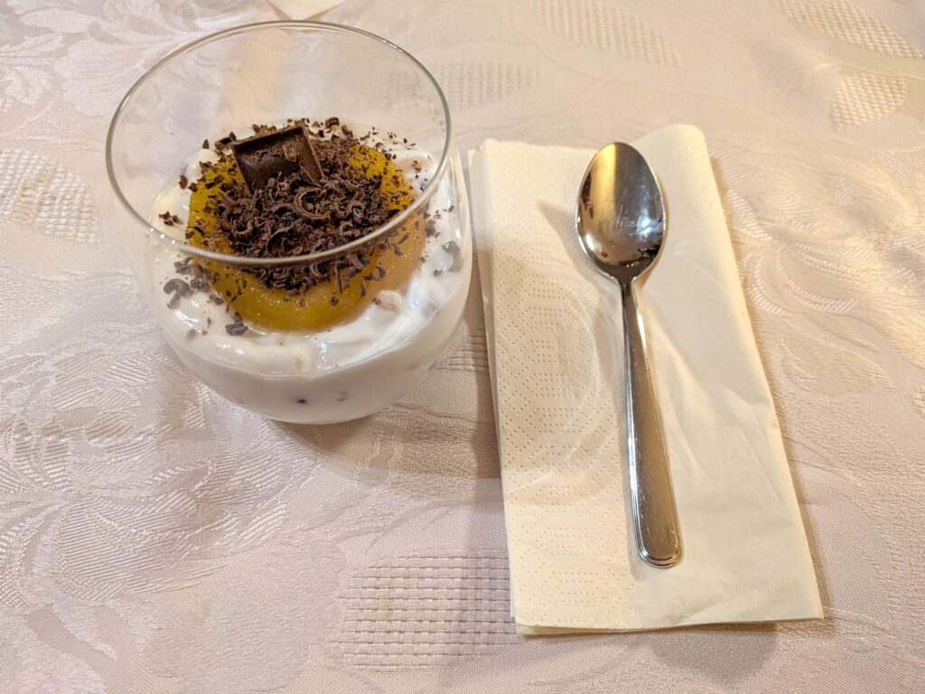 Die Kakis schälen. Eine Kaki kleinschneiden, eine Kaki pürieren. Die Sahne mit Vanillezucker steif schlagen. Die Kaki-Stücke sowie die Granatapfelkerne vorsichtig unterrühren und mit Honig abschmecken. Die Masse in ein Glas füllen und mit Kakipüree, geraspelter Schokolade und Schokoladenstücken garnieren.