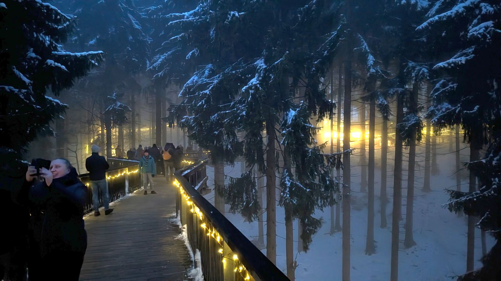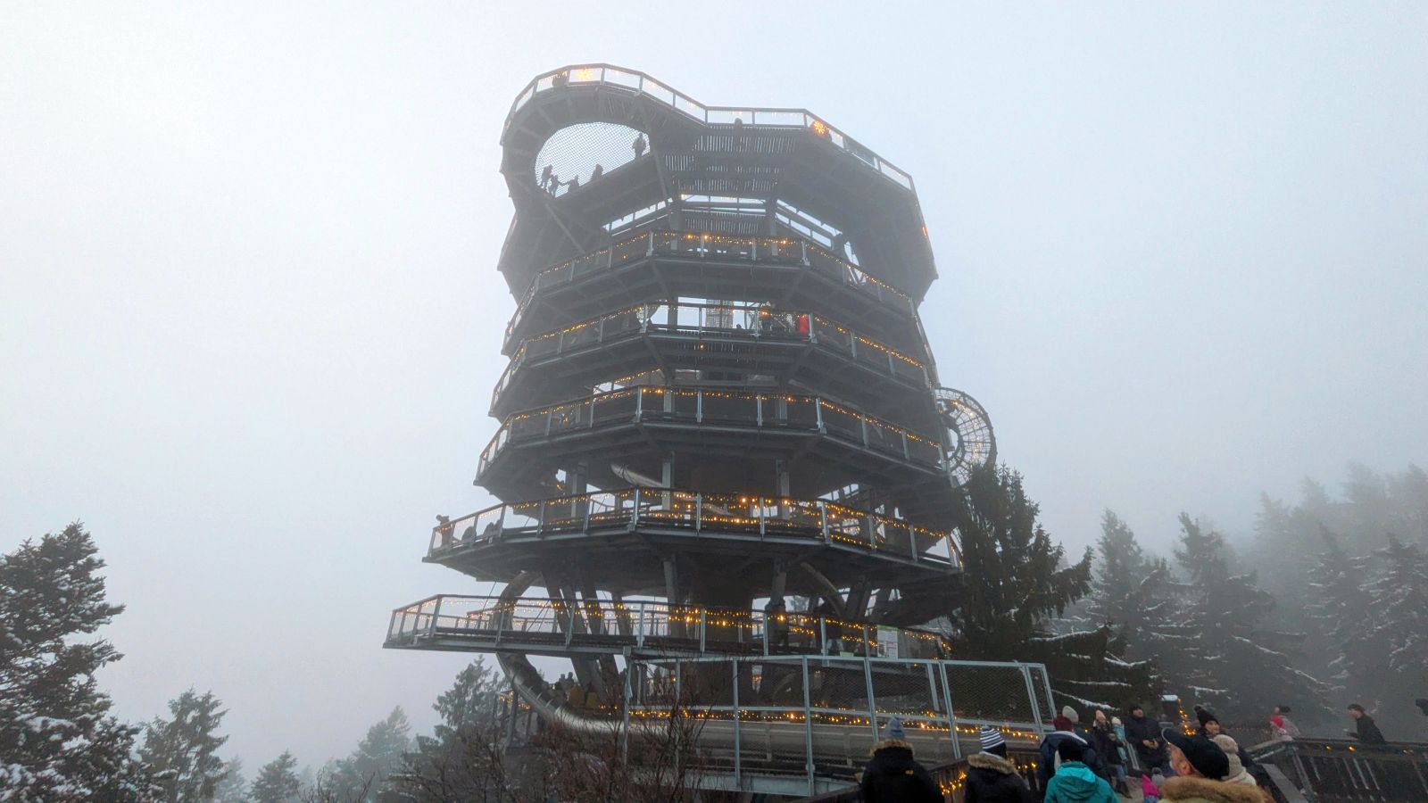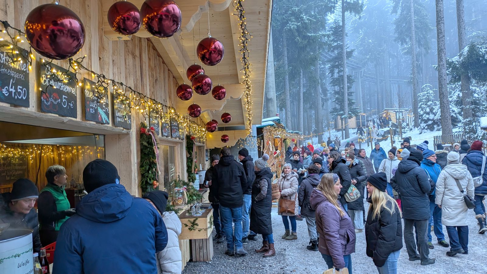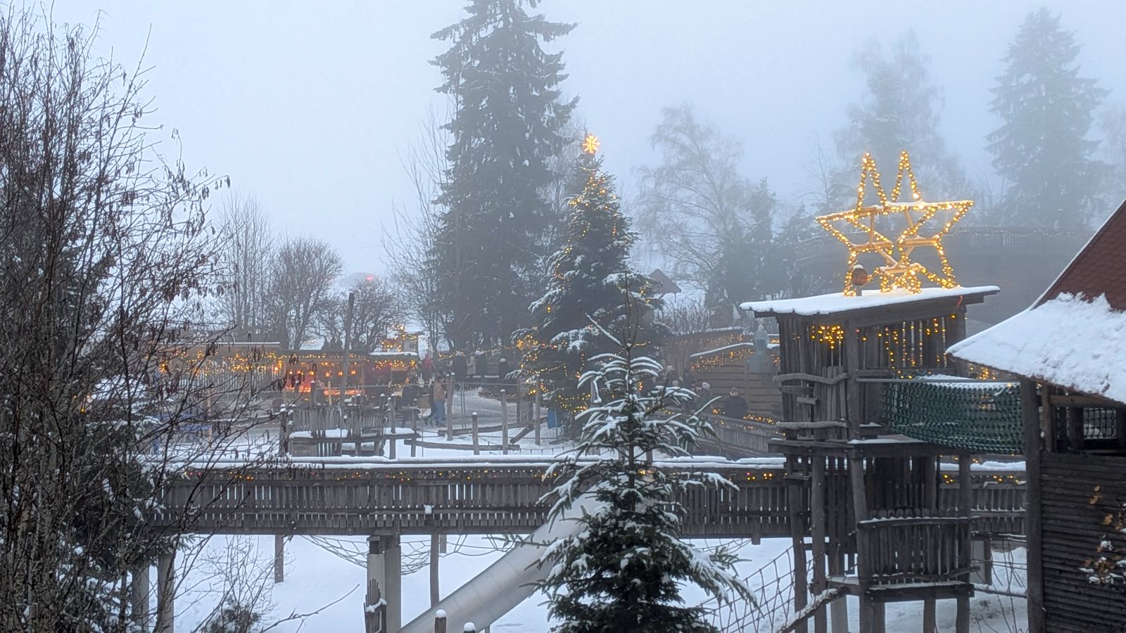 Das Frühstück am nächsten Morgen war sehr üppig und lecker. Danach gingen einige im Wald spazieren oder entspannten gleich wieder im Pool. Am Nachmittag ging es dann zum Weihnachtsmarkt. Leider war es sehr neblig. Nach einem Rundgang vorbei an Buden mit Weihnachtsdeko, Holzschnitzereien, Kerzen und Ähnlichem stärkten wir uns mit Glühwein, Waffeln bzw. Crêpes. Als es langsam dunkel wurde, sind wir auf den Waldturm gelaufen. Es war leider keine tolle Aussicht, da es neblig war. Von oben genossen wir das Lichtermeer unter uns. Als wir wieder unten ankamen, war es dunkel und die Lichter entlang des Weges und der Buden waren grandios. Nach dem Aufwärmen mit einem Glühwein mussten wir ins Hotel zurück. Dort erwartete uns ein leckeres 5-Gänge-Menü zum Abendessen. Den Abend ließen wir wieder an der Bar ausklingen.