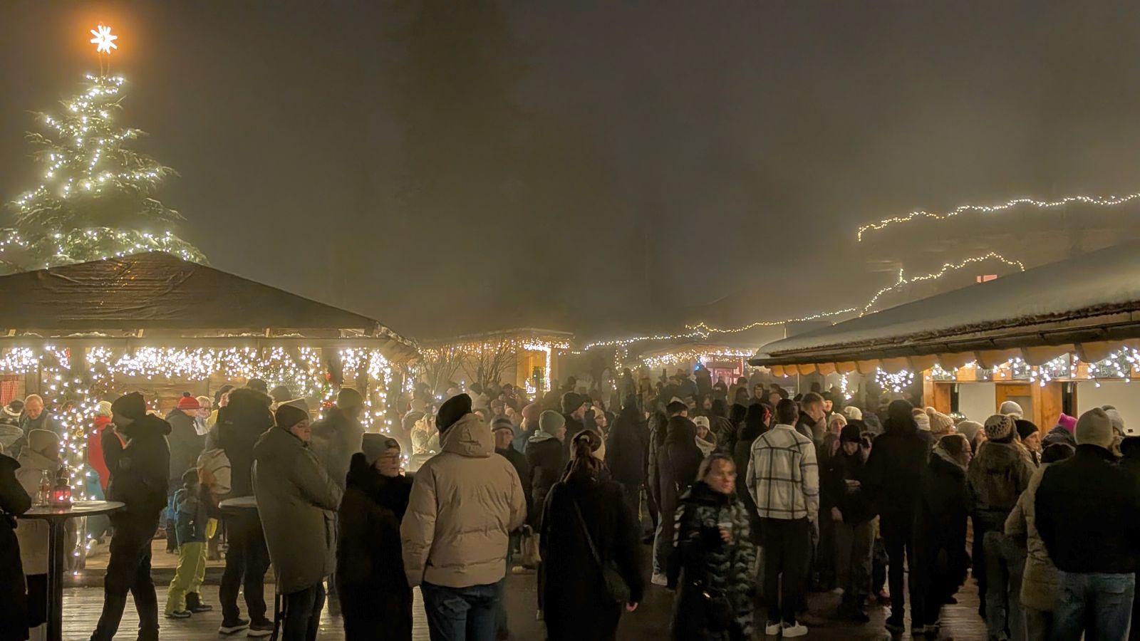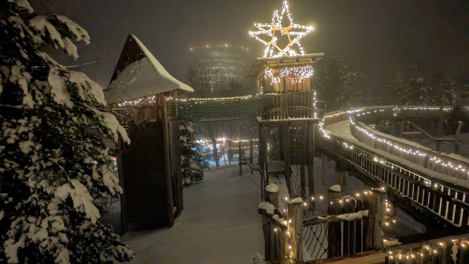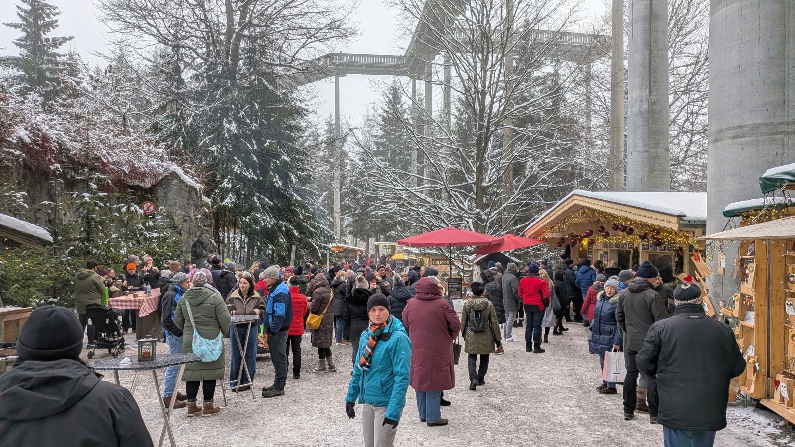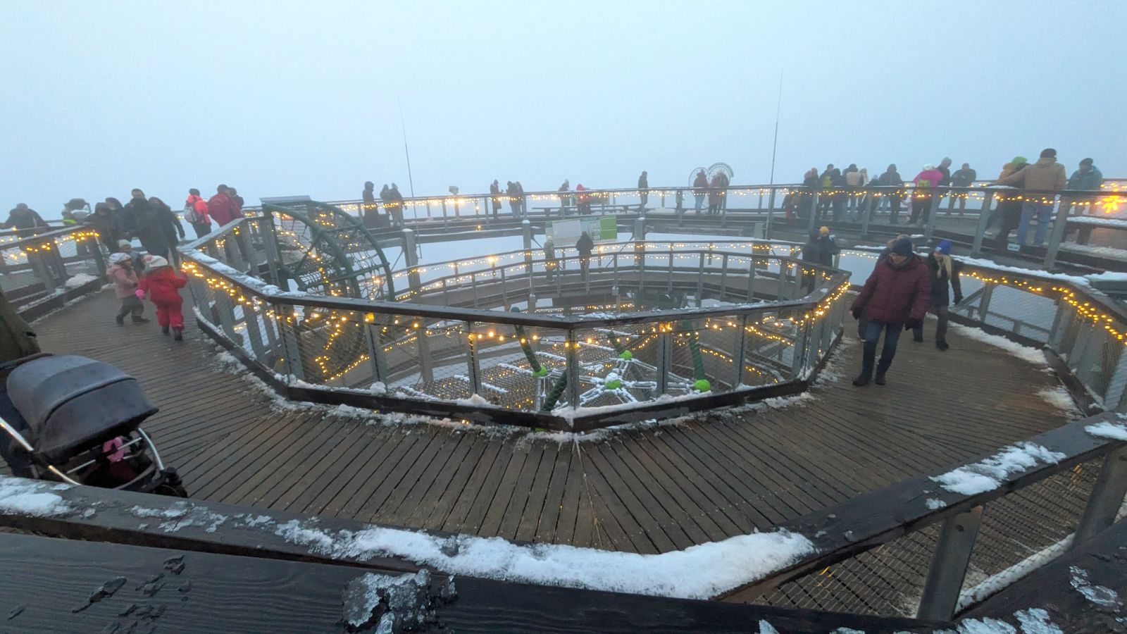 Das Frühstück am nächsten Morgen war sehr üppig und lecker. Danach gingen einige im Wald spazieren oder entspannten gleich wieder im Pool. Am Nachmittag ging es dann zum Weihnachtsmarkt. Leider war es sehr neblig. Nach einem Rundgang vorbei an Buden mit Weihnachtsdeko, Holzschnitzereien, Kerzen und Ähnlichem stärkten wir uns mit Glühwein, Waffeln bzw. Crêpes. Als es langsam dunkel wurde, sind wir auf den Waldturm gelaufen. Es war leider keine tolle Aussicht, da es neblig war. Von oben genossen wir das Lichtermeer unter uns. Als wir wieder unten ankamen, war es dunkel und die Lichter entlang des Weges und der Buden waren grandios. Nach dem Aufwärmen mit einem Glühwein mussten wir ins Hotel zurück. Dort erwartete uns ein leckeres 5-Gänge-Menü zum Abendessen. Den Abend ließen wir wieder an der Bar ausklingen.