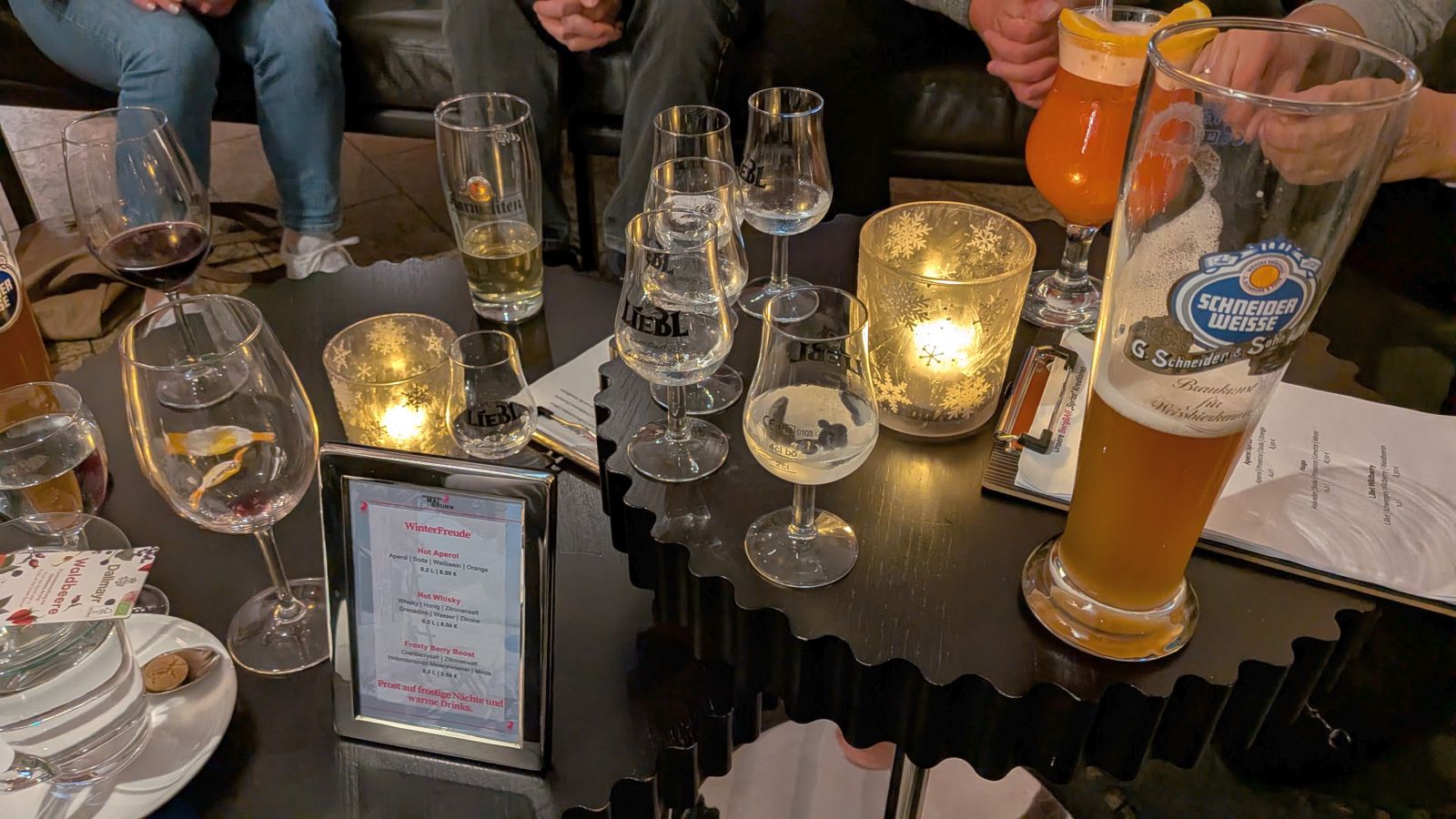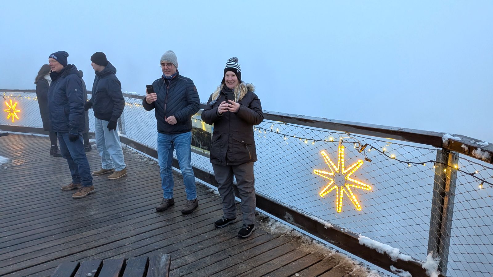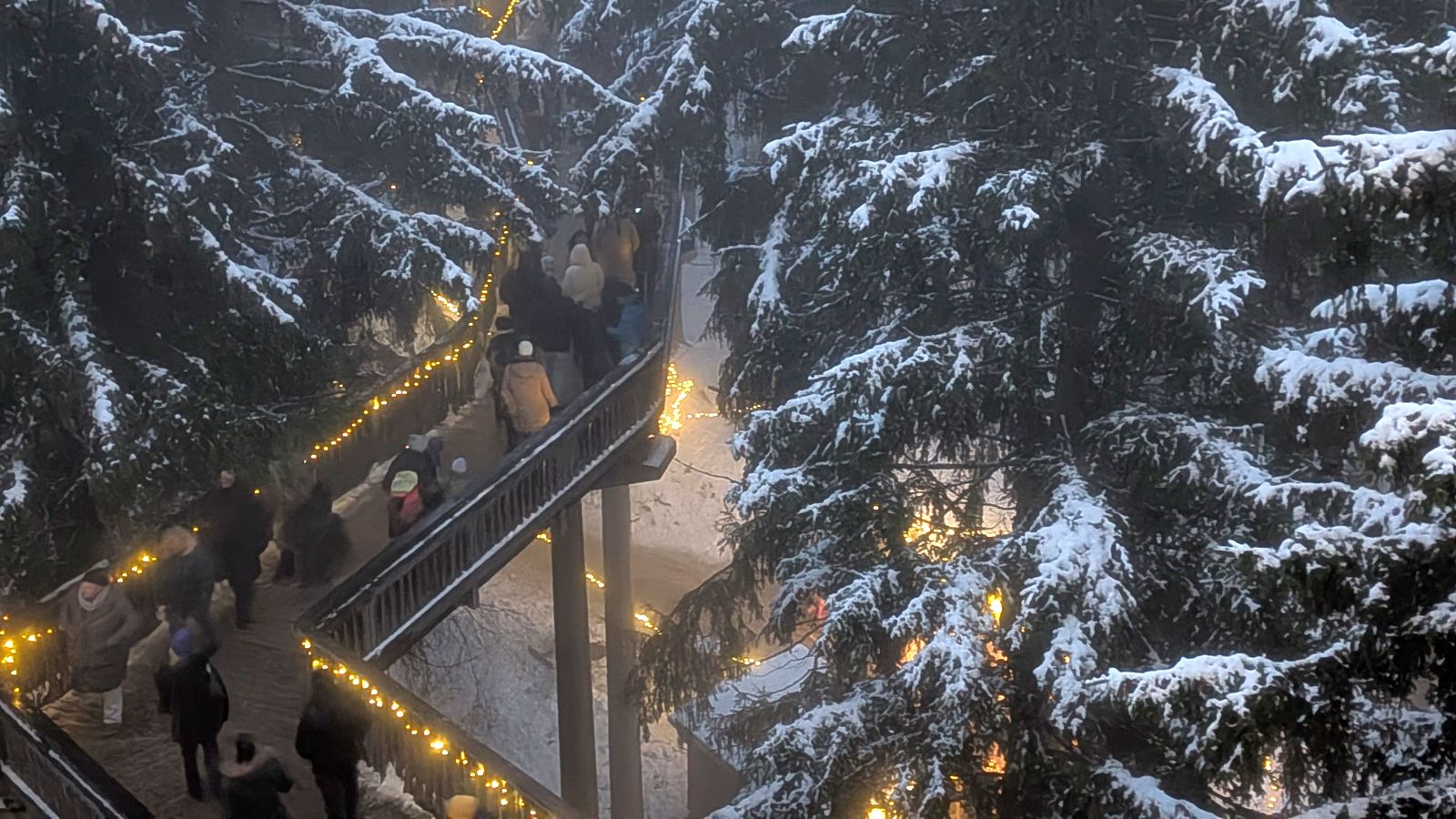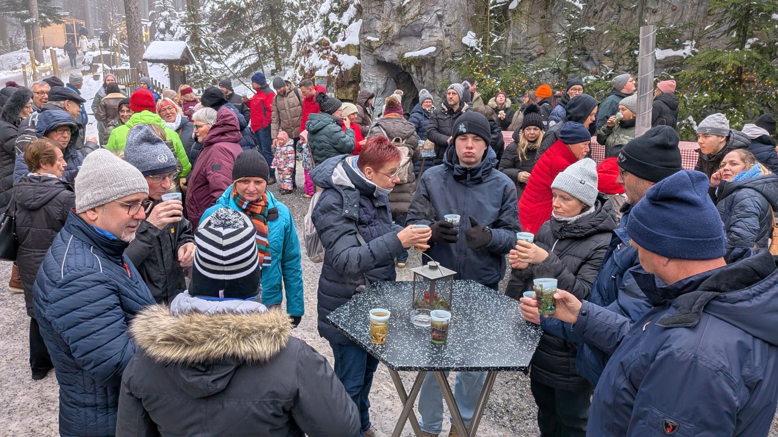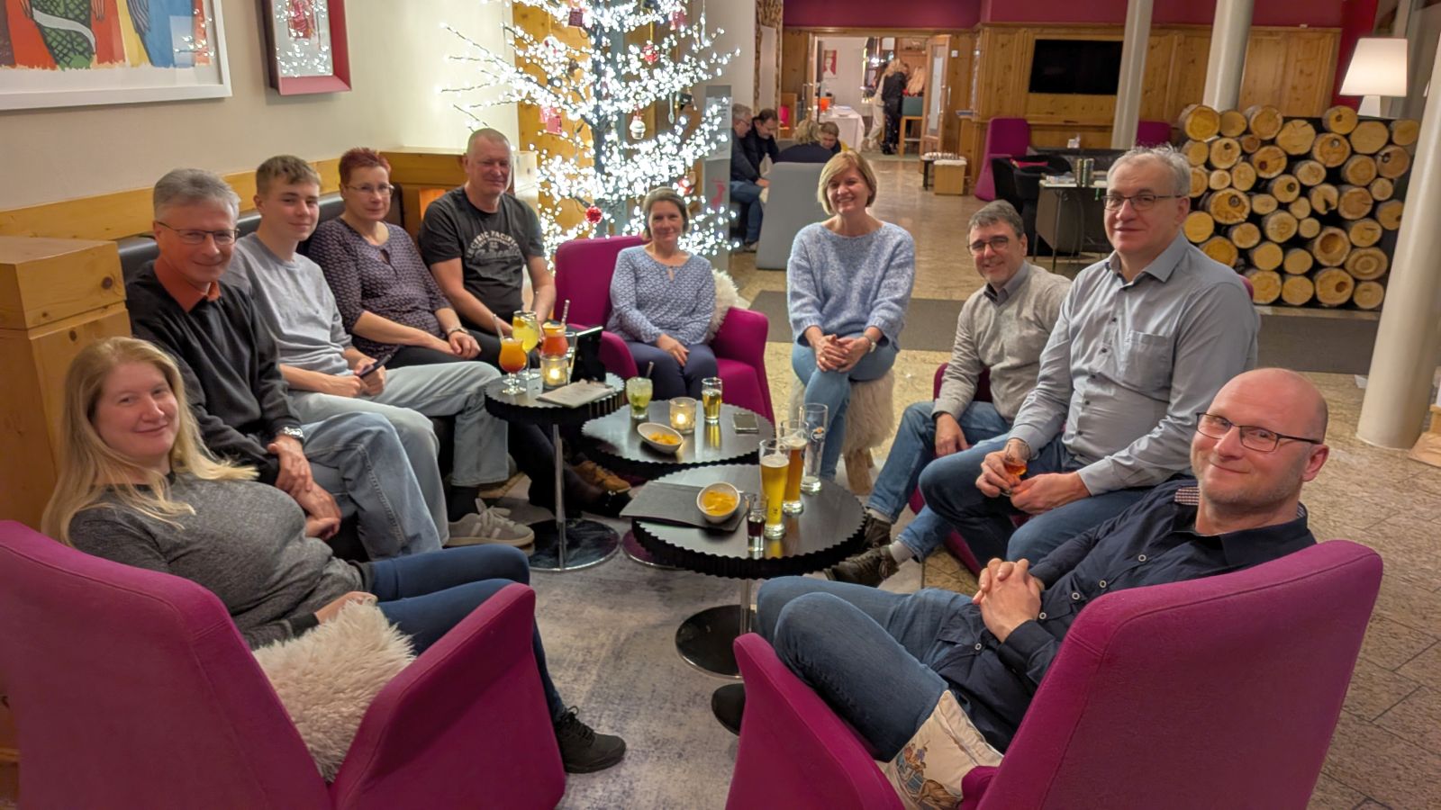 Das Frühstück am nächsten Morgen war sehr üppig und lecker. Danach gingen einige im Wald spazieren oder entspannten gleich wieder im Pool. Am Nachmittag ging es dann zum Weihnachtsmarkt. Leider war es sehr neblig. Nach einem Rundgang vorbei an Buden mit Weihnachtsdeko, Holzschnitzereien, Kerzen und Ähnlichem stärkten wir uns mit Glühwein, Waffeln bzw. Crêpes. Als es langsam dunkel wurde, sind wir auf den Waldturm gelaufen. Es war leider keine tolle Aussicht, da es neblig war. Von oben genossen wir das Lichtermeer unter uns. Als wir wieder unten ankamen, war es dunkel und die Lichter entlang des Weges und der Buden waren grandios. Nach dem Aufwärmen mit einem Glühwein mussten wir ins Hotel zurück. Dort erwartete uns ein leckeres 5-Gänge-Menü zum Abendessen. Den Abend ließen wir wieder an der Bar ausklingen.