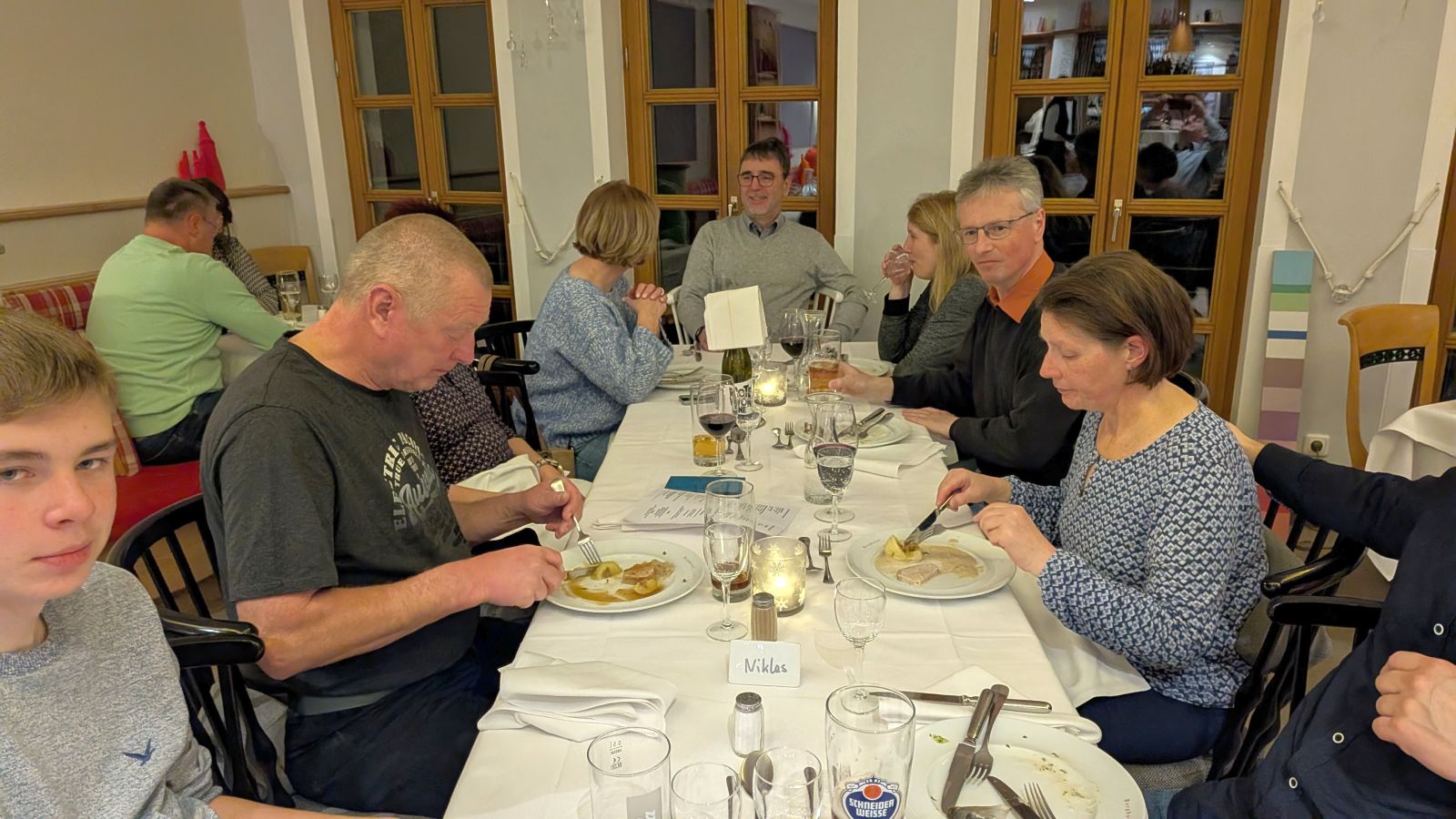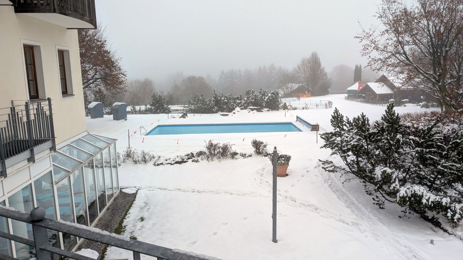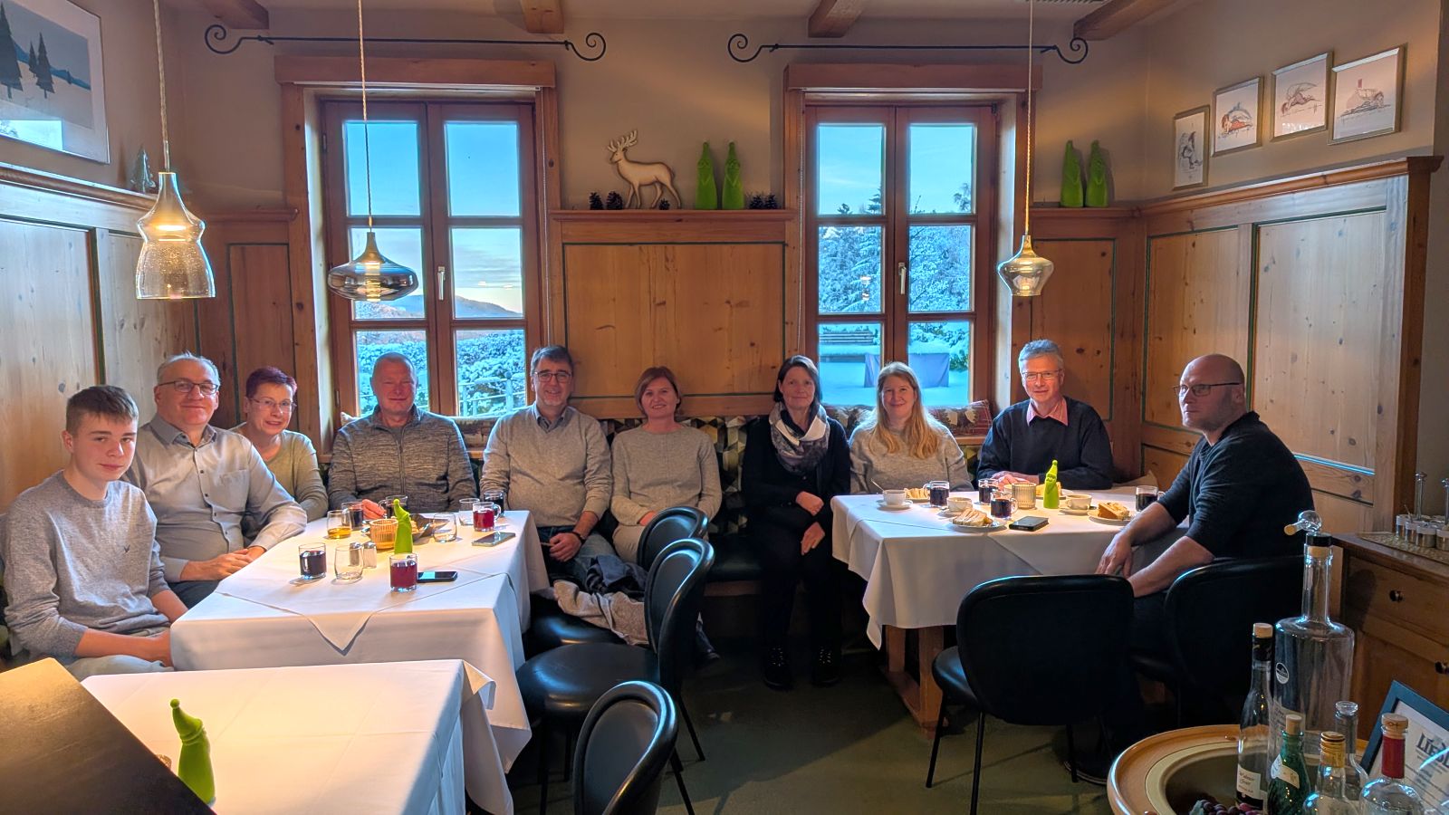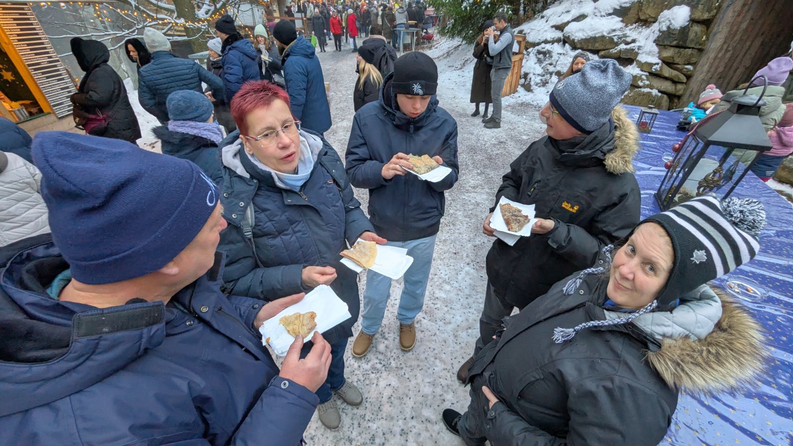 Das Frühstück am nächsten Morgen war sehr üppig und lecker. Danach gingen einige im Wald spazieren oder entspannten gleich wieder im Pool. Am Nachmittag ging es dann zum Weihnachtsmarkt. Leider war es sehr neblig. Nach einem Rundgang vorbei an Buden mit Weihnachtsdeko, Holzschnitzereien, Kerzen und Ähnlichem stärkten wir uns mit Glühwein, Waffeln bzw. Crêpes. Als es langsam dunkel wurde, sind wir auf den Waldturm gelaufen. Es war leider keine tolle Aussicht, da es neblig war. Von oben genossen wir das Lichtermeer unter uns. Als wir wieder unten ankamen, war es dunkel und die Lichter entlang des Weges und der Buden waren grandios. Nach dem Aufwärmen mit einem Glühwein mussten wir ins Hotel zurück. Dort erwartete uns ein leckeres 5-Gänge-Menü zum Abendessen. Den Abend ließen wir wieder an der Bar ausklingen.